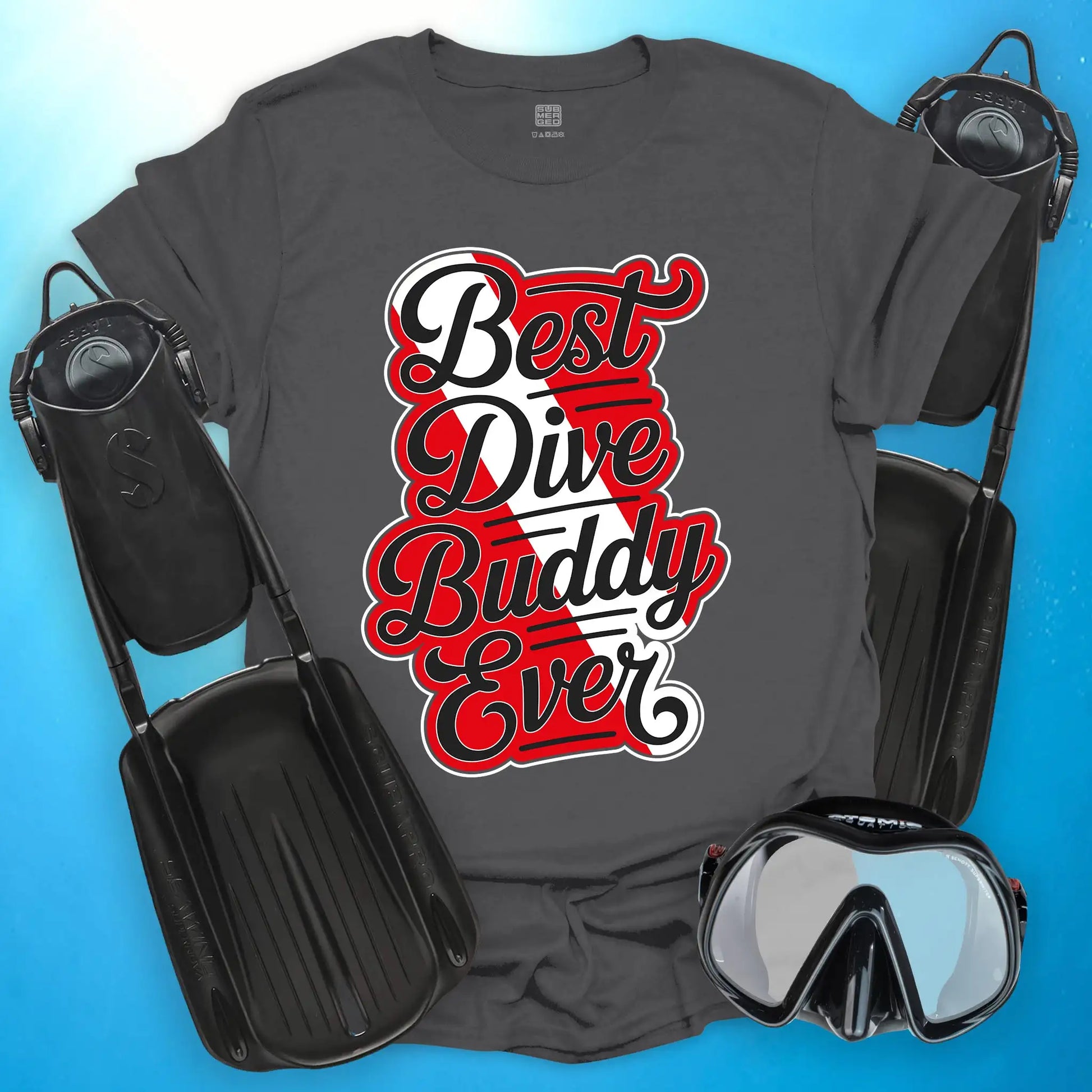 Celebrate the buddy system in style with the Best Dive Buddy Ever T-Shirt. Featuring bold, flowing typography over the iconic red and white dive flag, this design is a perfect tribute to the friends who make every dive unforgettable.