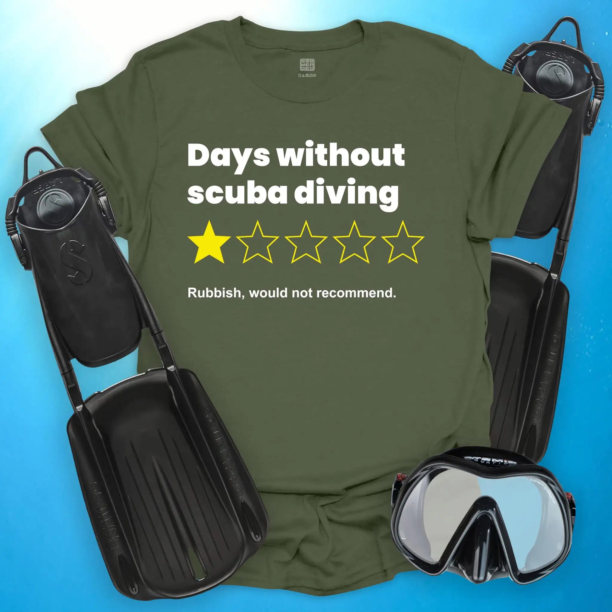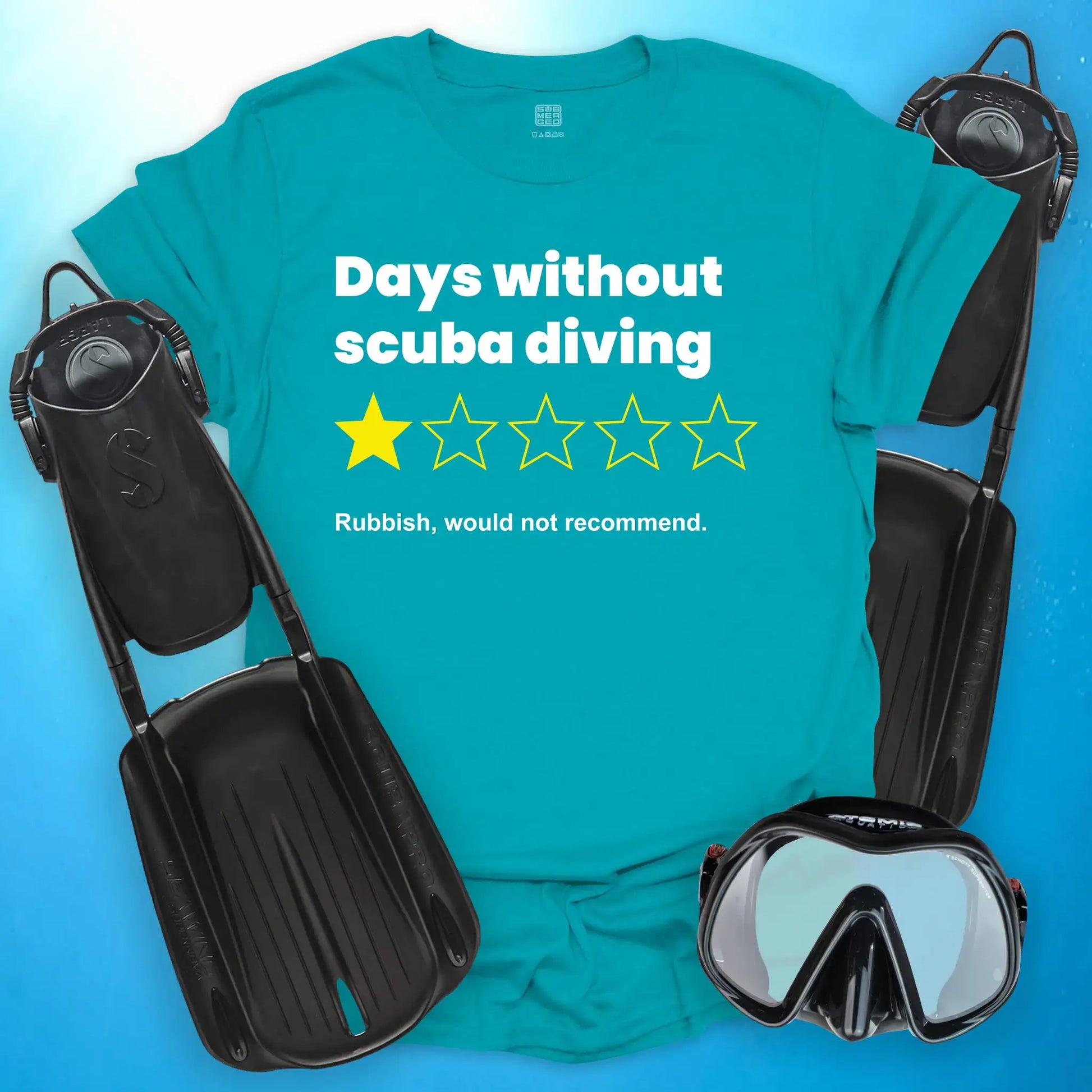 Every day out of the water is a day wasted — and this shirt says it with a laugh. The “Days Without Scuba Diving” T-shirt is a tongue-in-cheek take on the dreaded star rating, with a single star and the brutally honest review: “Rubbish, would not recommend.”