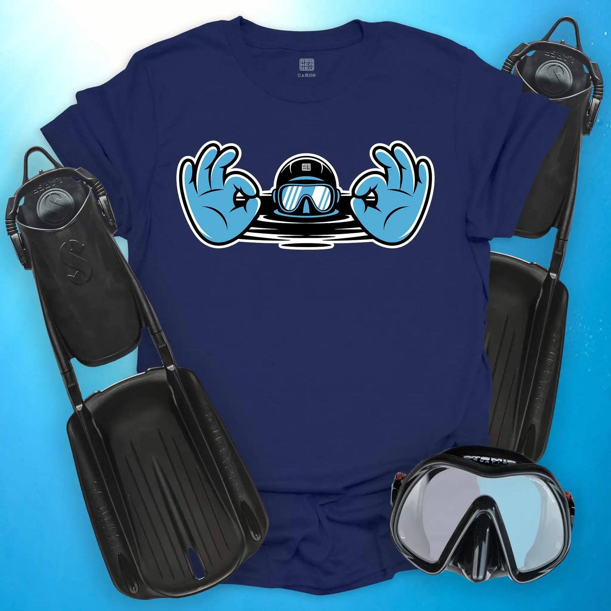 The Diver OK T-Shirt turns the classic scuba hand signal into a bold, graphic statement. Featuring a diver in a mask emerging from the water, framed by oversized blue “OK” hand signs, this clean design captures the universal language of divers everywhere.