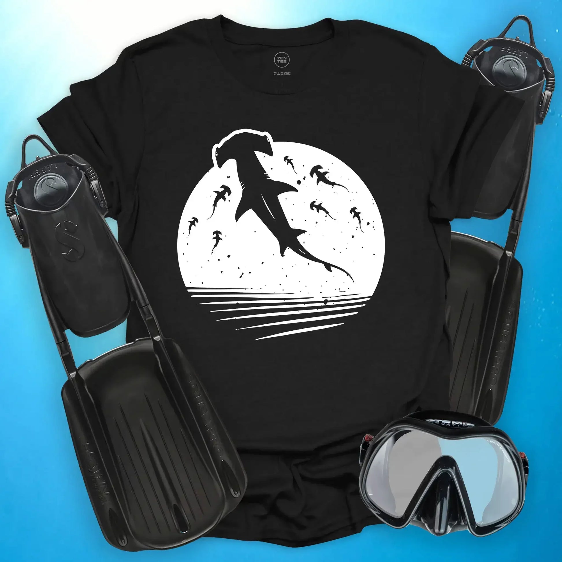 A deep-sea scene with an epic twist—The Rise of the Hammerheads T-Shirt captures the silent power of a schooling hammerhead formation, silhouetted against circle. With bold contrast and dynamic movement, this design feels like a graphic novel brought underwater.